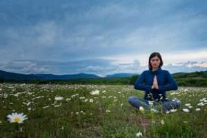A young woman doing yoga in the field.